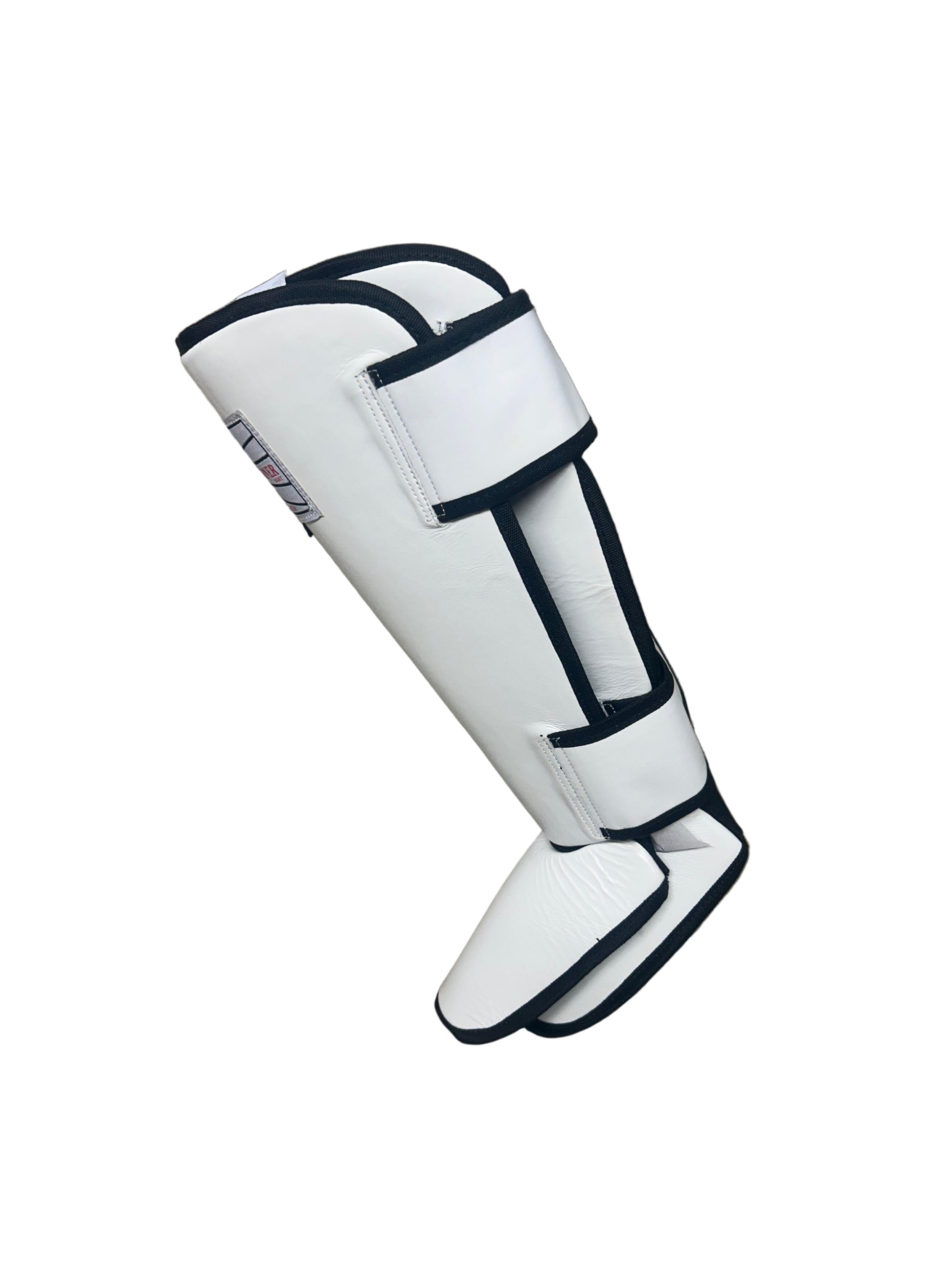 Blue Corner Sport-säärisuoja BC0046. Valkoinen (mustilla kanttauksilla, kuten toisessa kuvassa). Erittäin hyvä istuvuus. Laadukasta käsityötä vaativaan käyttöön, kaksinkertainen toppaus. Aitoa nahkaa.